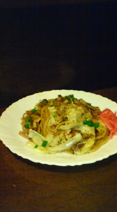 遅い昼でーす。ご飯炊き忘れて富士宮焼きそばを急きょ作りました。賞味期限が長い(冷凍で6ヶ月)富士宮焼きそばは冷凍庫に入ってると便利です。