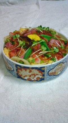 今日は桜エビの佃煮を使ってチラシ寿司を作ってみました。あっ!お茶! やっぱりお茶がなきゃね!